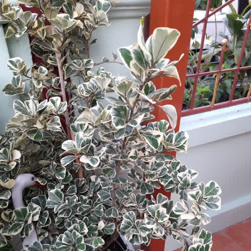 | คำอธิบาย : ต้นสาริกาลิ้นทองใบด่าง ชื่อวิทยาศาสตร์: Ficus deltoidea Jack f. variegata ชื่ออื่น: ไทรใบโพธิ์หัวกลับ Mistletoe fig Mistletoe rubber plant วงศ์: MORACEAE ลักษณะทางพฤกษศาสตร์ : ลำต้น ไม้ยืนต้น กึ่งผลัดใบ ลำต้นทรงกระบอก เปลือกสีเทาอมน้ำตาล ทุกส่วนมียางสีขาว ใบ ใบเดี่ยว เรียงเวียนสลับ รูปช้อน ปลายมน โคนสอบ ขอบเรียบ ใบหนาคล้ายแผ่นหนัง แผ่นใบสีเขียวเข้ม มีรอยด่างสีขาวอมเหลืองแผ่ตลอดทั้งขอบใบ และกระจายตามเส้นใบบางส่วน ข้อมูลทั่วไป : พัฒนาพันธุ์มาจากชนิดเดิมที่มีถิ่นกำเนิดอยู่ทางตอนใต้ของประเทศไทย การปลูกเลี้ยงและการใช้ประโยชน์ : การปลูกเลี้ยงดินทั่วไป ต้องการน้ำปานกลาง แสงแดดจัด การขยายพันธุ์ : ปักชำ ตอนกิ่ง |