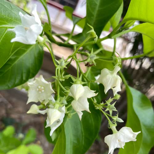 | คำอธิบาย : ชมนาด [ชม-มะ-นาด] หรือ ชำมะนาด (ชื่อวิทยาศาสตร์: Vallaris glabra; ชื่อพื้นเมืองอื่น ๆ คือ ดอกข้าวใหม่, อ้มส้าย (ภาคเหนือ), ชำมะนาดฝรั่ง) เป็นไม้รอเลื้อย จัดอยู่ในพวกไม้เถาขนาดกลาง สามารถแผ่ขยายได้ถึง 6–8 เมตร ใบเป็นใบเดี่ยว ออกตรงข้าม รูปไข่แกมรี ปลายแหลม โคนมน สีเขียว มีกลิ่นหอมเหมือนใบเตยซึ่งคล้ายกลิ่นข้าวใหม่ทำให้ได้ชื่อว่า "ข้าวใหม่" เป็นไม้ที่ชอบแดดจัดต้องการรับแสงแดดเต็มวัน ชอบดินร่วนซุยที่สามารถระบายน้ำได้ดี การใช้ประโยชน์ เป็นไม้ที่ดอกมีกลิ่นหอม บานช่วงเวลากลางคืน ใช้ทำน้ำอบ ข้าวแช่ |