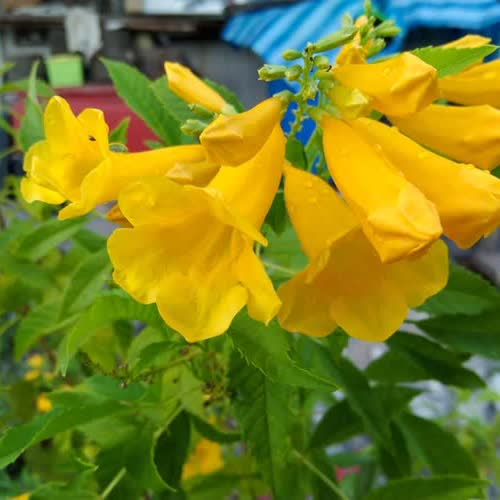 | คำอธิบาย : เป็นไม้พุ่มขนาดเล็กสูง 2-4 เมตร ลำต้นเล็ก แผ่กิ่งด้านบนเป็นพุ่มกลม โปร่ง ใบประกอบขนนกมีใบย่อยที่ปลายสุด จำนวน 7-11 ใบ สีเขียวอ่อน ขอบใบย่อยหยิกเป็นฟันเลื่อย ผิวสัมผัสละเอียด ลำต้นสีน้ำตาลนวลตลอดทั้งต้น ก้านใบช่อดอกอ่อนเป็นสีเขียว ดอกสีเหลืองสด มีรูปลักษณ์คลายระฆัง หรือแตร หรือทรัมเป็ต ออกดอกเป็นช่อตามปลายกิ่ง ดอกดกมาก และร่วงง่าย |