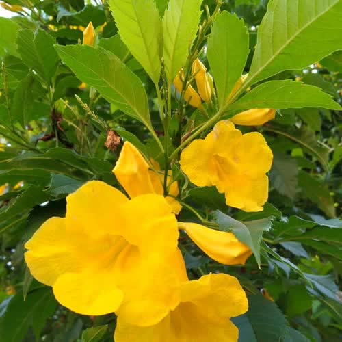 | คำอธิบาย : เป็นไม้พุ่มขนาดเล็กสูง 2-4 เมตร ลำต้นเล็ก แผ่กิ่งด้านบนเป็นพุ่มกลม โปร่ง ใบประกอบขนนกมีใบย่อยที่ปลายสุด จำนวน 7-11 ใบ สีเขียวอ่อน ขอบใบย่อยหยิกเป็นฟันเลื่อย ผิวสัมผัสละเอียด ลำต้นสีน้ำตาลนวลตลอดทั้งต้น ก้านใบช่อดอกอ่อนเป็นสีเขียว ดอกสีเหลืองสด มีรูปลักษณ์คลายระฆัง หรือแตร หรือทรัมเป็ต ออกดอกเป็นช่อตามปลายกิ่ง ดอกดกมาก และร่วงง่าย |
