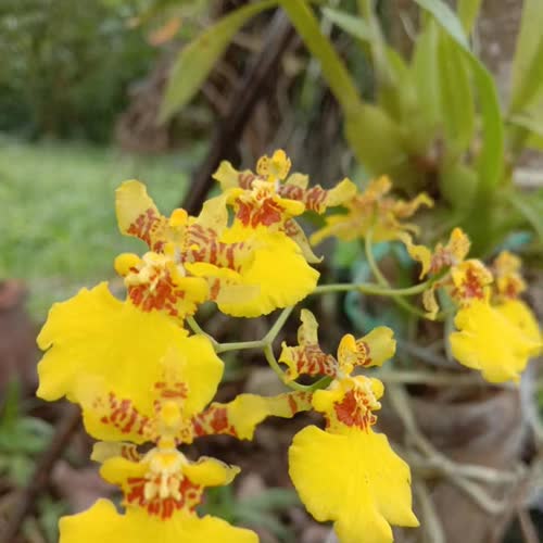 | คำอธิบาย : ออนซีเดียม โกลเดียนา (Oncidium Goldiana) เป็นลูกผสมระหว่าง เฟล็กซูโอซัม (Oncidium flexuosum) กับสฟาซิลาตัม (Oncidium sphacelatum) เป็น “กล้วยไม้สกุลออนซิเดียม” มีถิ่นกำเนิดในอเมริกา มีสีเหลืองสดใสยามต้องแสง กลีบดอกที่พลิ้วไหวเมื่อยามต้องลม ปากของดอกที่บานดูแล้วเหมือนกับกระโปรงบานๆ ที่มีลวดลายของตุ๊กตาบางครั้งก็เรียกว่า “ตุ๊กตาเริงระบำ” หรือ “นางระบำ” และบางทีก็เรียกว่า “กระโปรงแหม่ม” |