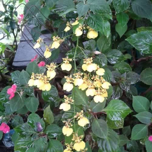 | คำอธิบาย : ออนซีเดียม โกลเดียนา (Oncidium Goldiana) เป็นลูกผสมระหว่าง เฟล็กซูโอซัม (Oncidium flexuosum) กับสฟาซิลาตัม (Oncidium sphacelatum) เป็น “กล้วยไม้สกุลออนซิเดียม” มีถิ่นกำเนิดในอเมริกา มีสีเหลืองสดใสยามต้องแสง กลีบดอกที่พลิ้วไหวเมื่อยามต้องลม ปากของดอกที่บานดูแล้วเหมือนกับกระโปรงบานๆ ที่มีลวดลายของตุ๊กตาบางครั้งก็เรียกว่า “ตุ๊กตาเริงระบำ” หรือ “นางระบำ” และบางทีก็เรียกว่า “กระโปรงแหม่ม” |
