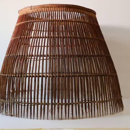 | คำอธิบาย : มีลักษณะทำจากไม้ไผ่ ผ่าเป็นเสี่ยงๆ เหลาให้เป็นดิ้วหลายๆ ใช้ลวดหรือไม้ดัดให้โค้งเป็นวงกลม เหลาไม้ดิ้วให้แหลมทุกดิ้วแล้วนำมามัดติดกับลวดที่ดัดโค้ง ๓ อัน แต่ละดิ้วห่างกันประมาณ ๑ ซม. จนรอบเป็นวงกลม ข้างล่างจะโตกว่าข้างบน ส่วนข้างบนทำรูไว้สำหรับให้มือล้วงจับปลาได้ และทำขอบข้างบนให้แน่น เสร็จแล้วนำตัวสุ่มไปลมควันไฟเพื่อให้ไม้ไผ่แห้งและแข็งแรงยิ่งขึ้น |