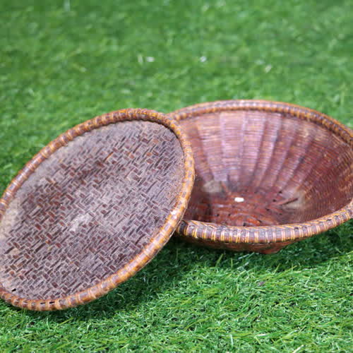 คำอธิบาย : มีลักษณะเป็นไม้ไผ่สาน เป็นตะกร้าไว้ใส่ของจะมีฝาปิดไม่ให้ของด้านในหล่น หรือเอาไว้ใส่เงิน เวลาขายของที่ตลาด |