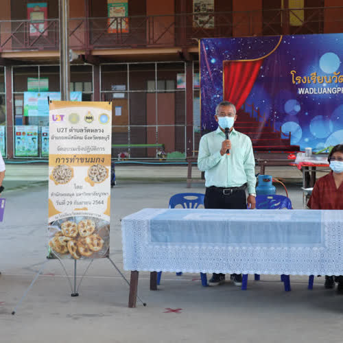 | คำอธิบาย : ภาพโครงการยกระดับเศรษฐกิจและสังคมรายตำบลแบบบูรณการ (U2T) บรรยากาศการเปิดงาน การจัดอบรมเชิงปฏิบัติการ การทำขนมกง โดยสำนักหอสมุด มหาวิทยาลัยบูรพา ณ โรงเรียนวัดหลวงพรหมาวาส (พหลราษฎร์อุทิศ) ตำบลวัดหลวง อำเภอพนัสนิคม จังหวัดชลบุรี |