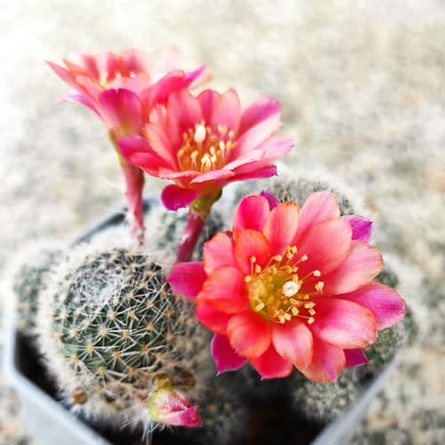 | คำอธิบาย : รีบูเทีย (rebutia) เป็นไม้อวบน้ำสกุล Cataceae ทรงกลมหรือรี มีสีเขียวหรือเขียวอมเทา มีขนาดเล็ก แตกหนอเป็นกอ ลำต้นมีตุ่มหนามเล็ก ๆ และมีหนามปกคลุมทั่วลำต้น มีทั้งหนามรัศมีและหนามกลาง หนามมีลักษณะแผ่กระจายและแนบไปกับลำต้น เนื่องจากเป็นหนามเล็กๆ จึงสามารถจับได้ด้วยมือเปล่า มีกลีบดอกเรียงตัวซ้อนกันสวยงาม ถิ่นกำเนิดในโบลิเวียและอาเจนตินา |