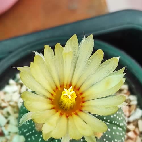 | คำอธิบาย : Astrophytum asterias (แอสโตรไฟตัม แอสทีเรียส) เป็นพันธุ์ที่ไม่มีหนาม จับได้สบายมือ ชื่อสามัญภาษาอังกฤษคือ Sand Dollar Cactus หรือ Sea Urchin Cactus (sand dollar หรือ sea urchin เป็นสัตว์ทะเลที่มีเปลือกแข็งตระกูลเดียวกับปลาดาว หรือหอยเม่น ลำต้นค่อนข้างเล็ก รูปร่างออกกลมแป้น ชนิดดั้งเดิมจะมี 8 พู ลักษณะของสันพูจะเรียบแบน ร่องระหว่างพูจะค่อนข้างตื้น มีตุ่มหนาม (areole) เรียงเป็นแนวอยู่บริเวณกลางพู แต่ไม่มีหนาม |