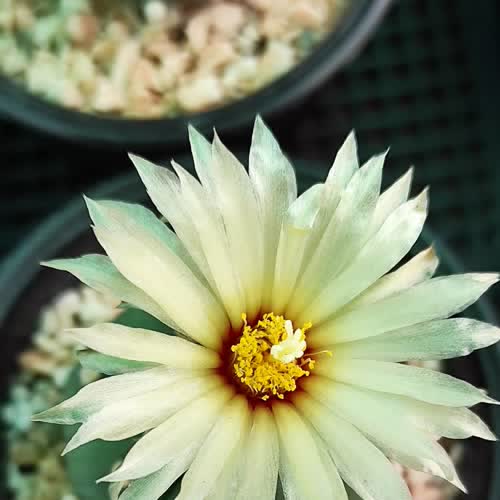 | คำอธิบาย : Astrophytum asterias (แอสโตรไฟตัม แอสทีเรียส) เป็นพันธุ์ที่ไม่มีหนาม จับได้สบายมือ ชื่อสามัญภาษาอังกฤษคือ Sand Dollar Cactus หรือ Sea Urchin Cactus (sand dollar หรือ sea urchin เป็นสัตว์ทะเลที่มีเปลือกแข็งตระกูลเดียวกับปลาดาว หรือหอยเม่น ลำต้นค่อนข้างเล็ก รูปร่างออกกลมแป้น ชนิดดั้งเดิมจะมี 8 พู ลักษณะของสันพูจะเรียบแบน ร่องระหว่างพูจะค่อนข้างตื้น มีตุ่มหนาม (areole) เรียงเป็นแนวอยู่บริเวณกลางพู แต่ไม่มีหนาม |