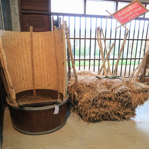 | คำอธิบาย : ลักษณะของถังฟาดข้าวโบราณเป็นถังขนาดใหญ่ ทำด้วยไม้เป็นรูปวงรี ประกอบด้วยบันไดฟาดข้าววางตามความยาวของถัง |