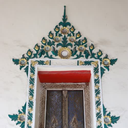 คำอธิบาย : บานประตูหน้าต่างไม้เขียนลายรดน้ำ ที่มุมพระอุโบสถและกึ่งกลางช่องหน้าต่างช่องกลางประดิษฐานใบเสมาปูนปั้น |