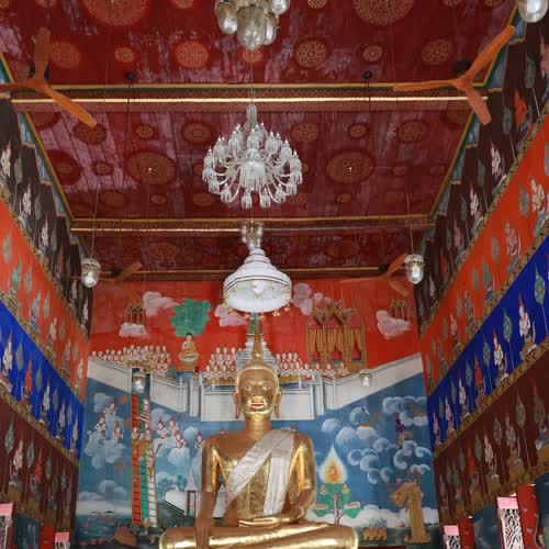 คำอธิบาย : ภายในพระอุโบสถประดิษฐานพระพุทธ รูปปูนปั้น ปางมารวิชัย ด้านข้างมีพระอัครสาวกประทับยืน ทำด้วยโลหะ พื้นพระอุโบสถปูด้วยกระเบื้องเคลือบลายคราม |