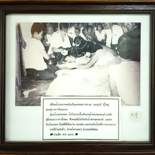 | คำอธิบาย : พิธีรดน้ำประสาทพรอันเป็นมงคลของ พ่อ-แม่ และญาติ ผู้ใหญ่ ของคู่บ่าวสาวที่แต่งงาน ผู้รดน้ำประสาทพร น้ำถ้วยกระเบื้องที่บรรจุน้ำพระพุทธมนต์ มาหลั่งสู่มือของบ่าว-สาวทั้งสอง ซึ่งพนมมือไหว้รอรับน้ำพระพุทธมนต์ และพรอันเป็นมงคล เป็นพิธีที่เรียบง่าย ประหยัด และครบถ้วนในพิธีการทุกประการ ถ่ายที่บ้านทับข้าว ตำบลโคกเพลาะ อำเภอพนัสนิคม ถ่ายเมื่อ พ.ศ. 2501 |