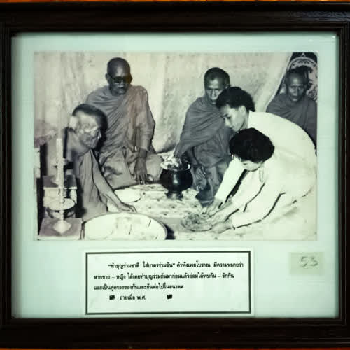 คำอธิบาย : ทำบุญร่วมชาติ ใส่บาตรร่วมขัน คำพังเพยโบราณ มีความหมายว่า หากชาย-หญิง ได้เคยทำบุญร่วมกันมาก่อนแล้วย่อมได้พบกัน-รักกัน และเป็นคู่ครองของกันและกันต่อไปในอนาคต |