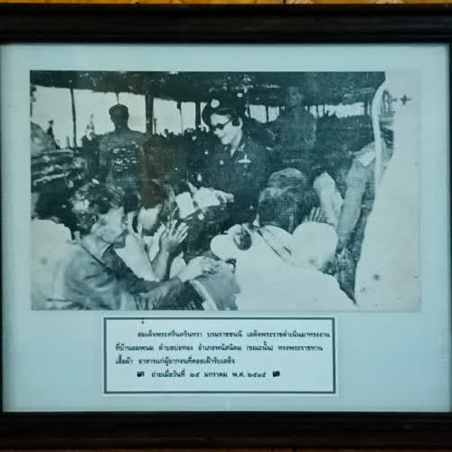 | คำอธิบาย : สมเด็จพระศรีนครินทรา บรมราชชนนี เสด็จพระราชดำเนินมาทรงงานที่บ้านอมพนม ตำบลบ่อทอง อำเภอพนัสนิคม (ขณะนั้น) ทรงพระราชทานเสื้อผ้า อาหารแก่ผู้ยากจนที่คอยเฝ้ารับเสด็จ |