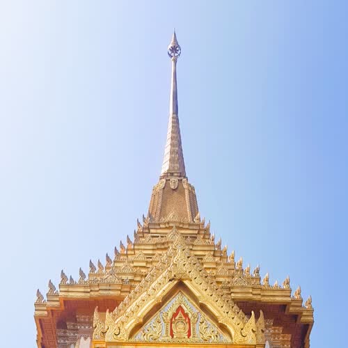 | คำอธิบาย : พระมหามณฑปเป็นอาคารจัตุรมุขทรงปราสาท ซึ่งโอฬารด้วยขนาดความกว้าง 30 เมตร สูง 60 เมตร โครงสร้างหลักเป็นคอนกรีตสำเร็จ ผนังภายนอกบุด้วยหินอ่อนไวท์คาร์ราร่า ส่วนประกอบเครื่องยอด เช่น บันแถลง เป็นโลหะหล่อปิดทอง ประดิษฐานตราสัญลักษณ์พระราชพิธีมหามงคลเฉลิมพระชนมพรรษา 80 พรรษา 5 ธันวาคม 2550 ไว้ที่หน้าบัน ยอดสูงสุดของพระมหามณฑปเป็นฉัตร 7 ชั้น (ข้อมูลจาก : www.goldtraders.or.th) |
