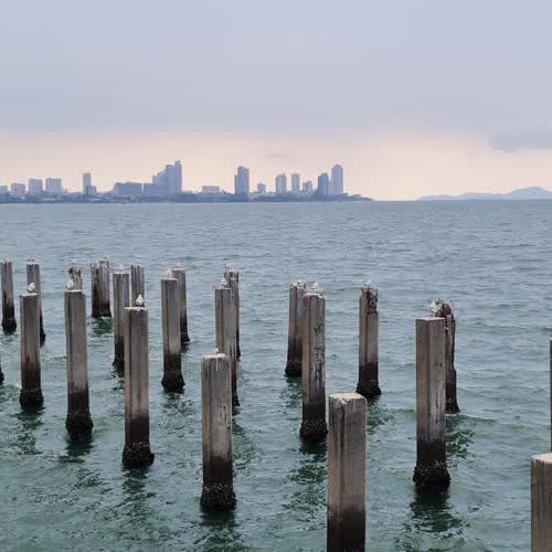 | ชื่อเรื่อง : นกเกาะเสาซีเมนต์ในทะเล |
