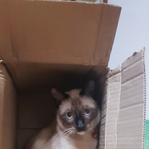| คำอธิบาย : แมวไทยพันธ์ุผสมวิเชียรมาศ ในกล่องกระดาษ |