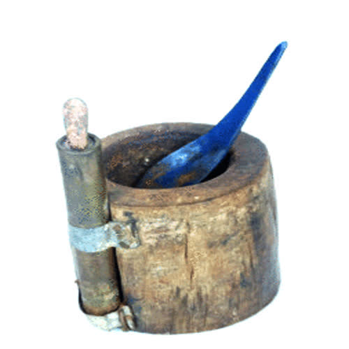 | คำอธิบาย : เป็นครกตำหมาก ทำจากไม้ขุด พร้อมสากและช้อนสังกะสี ครกขนาดเล็ก มีรอยถลอก สำหรับตำหมากพลูก่อนกิน |