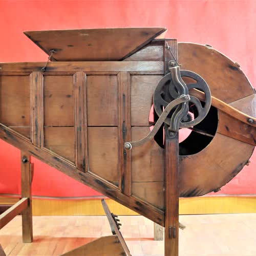 | คำอธิบาย : มีลักษณะทำจากไม้ผสมเครื่องเหล็ก รูปทรง มีลักษณะเป็นกล่อง มีขา ๔ ขา ด้านหลังกลมมน อีกด้านโปร่ง ด้านบนมีที่สำหรับใส่ข้าวเปลือกให้ไหลลงสู่ตระแกงเหล็ก ที่มีลักษณะห่างๆ ด้านหน้ามีใบพัดหมุนด้วยมือ ใบพัด จะพัดเศษผงและข้าวลีบออกไปด้านหลัง ข้าวดีที่มีน้ำหนักมากกว่า จะตกลงด้านหน้าสีฝัด |