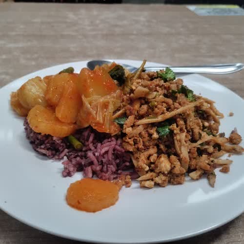 | คำอธิบาย : ข้าวกล้อง ราดด้วยแกงส้มเจและลาบเจ |