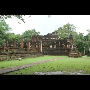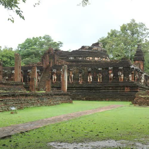 | คำอธิบาย : วัดช้างรอบ อุทยานประวัติศาสตร์กำแพงเพชร เป็นวัดใหญ่ที่สุด และสำคัญที่สุดในบรรดาวัดนอกกำแพงเมืองตั้งอยู่บนเนินสูง เจดีย์ประธานเป็นเจดีย์ทรงลังกา รูประฆังกลม มีพระเจดีย์ใหญ่ตั้งอยู่กลางลาน ฐานเจดีย์กว้าง 31 เมตร สี่เหลี่ยมที่ฐานเจดีย์เป็นรูปช้างครึ่งตัวเห็นแต่ 2 ขาหน้า หันศีรษะออกจากฐานรายรอบเจดีย์ เป็นช้างทรงเครื่องจำนวน 68 เชือก |
