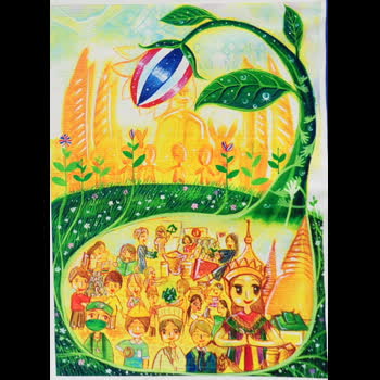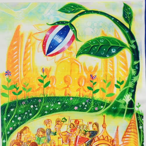 ภาพวาดชิงทุนการศึกษาในหัวข้อ ประเทศไทย คือบ้านของเรา เราจะก้าวไปด้วยกันอย่างเข้มแข็ง