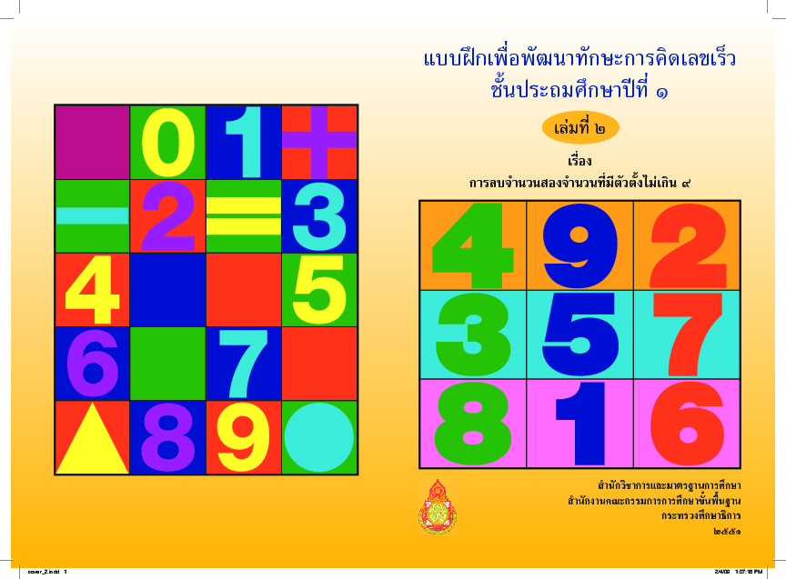 | ชื่อเรื่อง : แบบฝึกเพื่อพัฒนาทักษะการคิดเลขเร็ว เรื่อง การลบจำนวนสองจำนวนที่มีผลบวกไม่เกิน 9 |