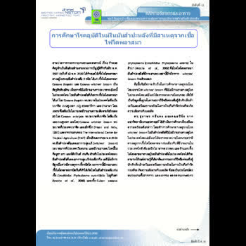 | ชื่อเรื่อง : การศึกษาโรคอุบัติใหม่ในมันสำปะหลังที่มีเชื้อสาเหตุจากเชื้อไฟโตพลาสมา |