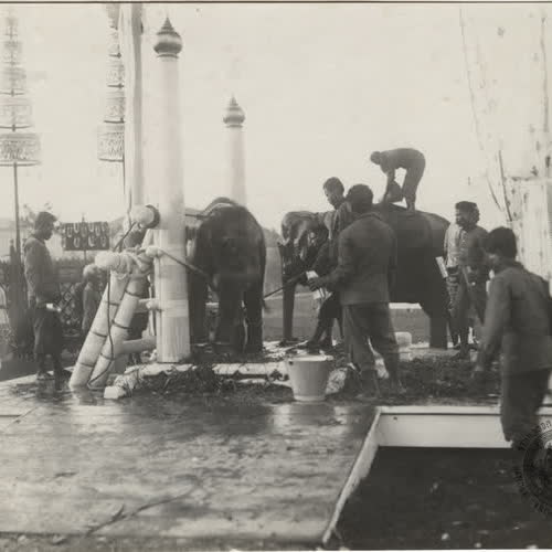 | คำอธิบาย : ร.7 เสด็จมณฑลฝ่ายเหนือ พ.ศ.2469 พิธีรับและขึ้นระวางสมโภชพระเศวตคชเดชน์ดิลกการอาบน้ำช้างพลายสำคัญในโรงมณฑป |