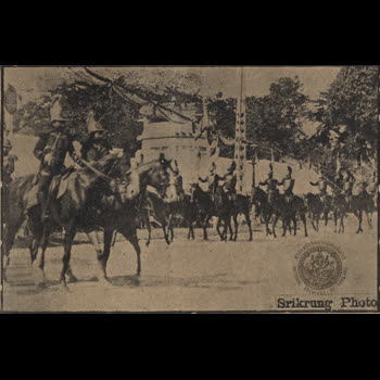 | คำอธิบาย : สมุดภาพแห่สลากภัตต์ในพิธีรับและขึ้นระวางสมโภชพระเศวตคชเดชน์ดิลก พฤศจิกายน 2470ขบวนกองทหารม้าของกระทรวงวัง สตรีแต่งกายทหารม้าเกราะทองถือทวนเดินเรียง 4 เมื่อวันแห่สลากภัตต์สมโภชพระเศวตคชเดชน์ดิลก วันที่ 16 พฤศจิกายน พ.ศ.2470 |