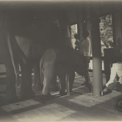| ชื่อเรื่อง : ร.7 เสด็จมณฑลฝ่ายเหนือ พ.ศ.2469 พิธีรับและขึ้นระวางสมโภชพระเศวตคชเดชน์ดิลก ช้างเผือกกับช้างแม่อยู่ในโรงสมโภช ที่นครเชียงใหม่ |