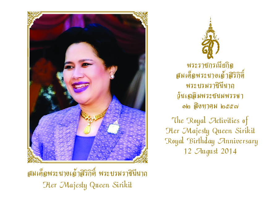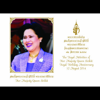 (2559). "แผ่นพับพระราชกรณียกิจสมเด็จพระนางเจ้าสิริกิติ์ พระบรมราชินีนาถ วันเฉลิมพระชนมพรรษา ๑๒ สิงหาคม ๒๕๕๗".