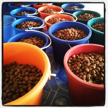 | คำอธิบาย : อาหารปลาบรรจุในถังหูหิ้ว พบเห็นได้บ่อยครั้งบริเวณท่าน้ำภายในวัด เพื่อจำหน่ายให้กับผู้ใจบุญไว้ซื้อให้อาหารกับปลาภายในเขตอภัยทานของวัด |