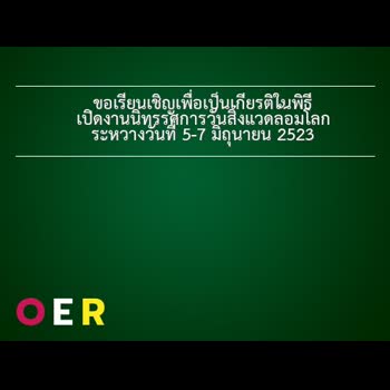 ขอเรียนเชิญเพื่อเป็นเกียรติในพิธีเปิดงานนิทรรศการวันสิ่งแวดล้อมโลก ระหว่างวันที่ 5-7 มิถุนายน 2523 ได้รับใบอนุญาตภายใต้ ให้เผยแพร่-โดยต้องระบุที่มาแต่ห้ามดัดแปลงและห้ามใช้เพื่อการค้า 3.0 Thailand.