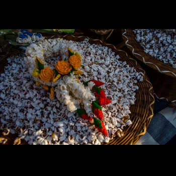 | คำอธิบาย : ข้าวตอก การนำข้าวเปลือกมาคั่วจนแตกเป็นดอกขาวว ใช้ในงานพิธีกรรม งานมงคล |