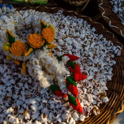 คำอธิบาย : ข้าวตอก การนำข้าวเปลือกมาคั่วจนแตกเป็นดอกขาวว ใช้ในงานพิธีกรรม งานมงคล |