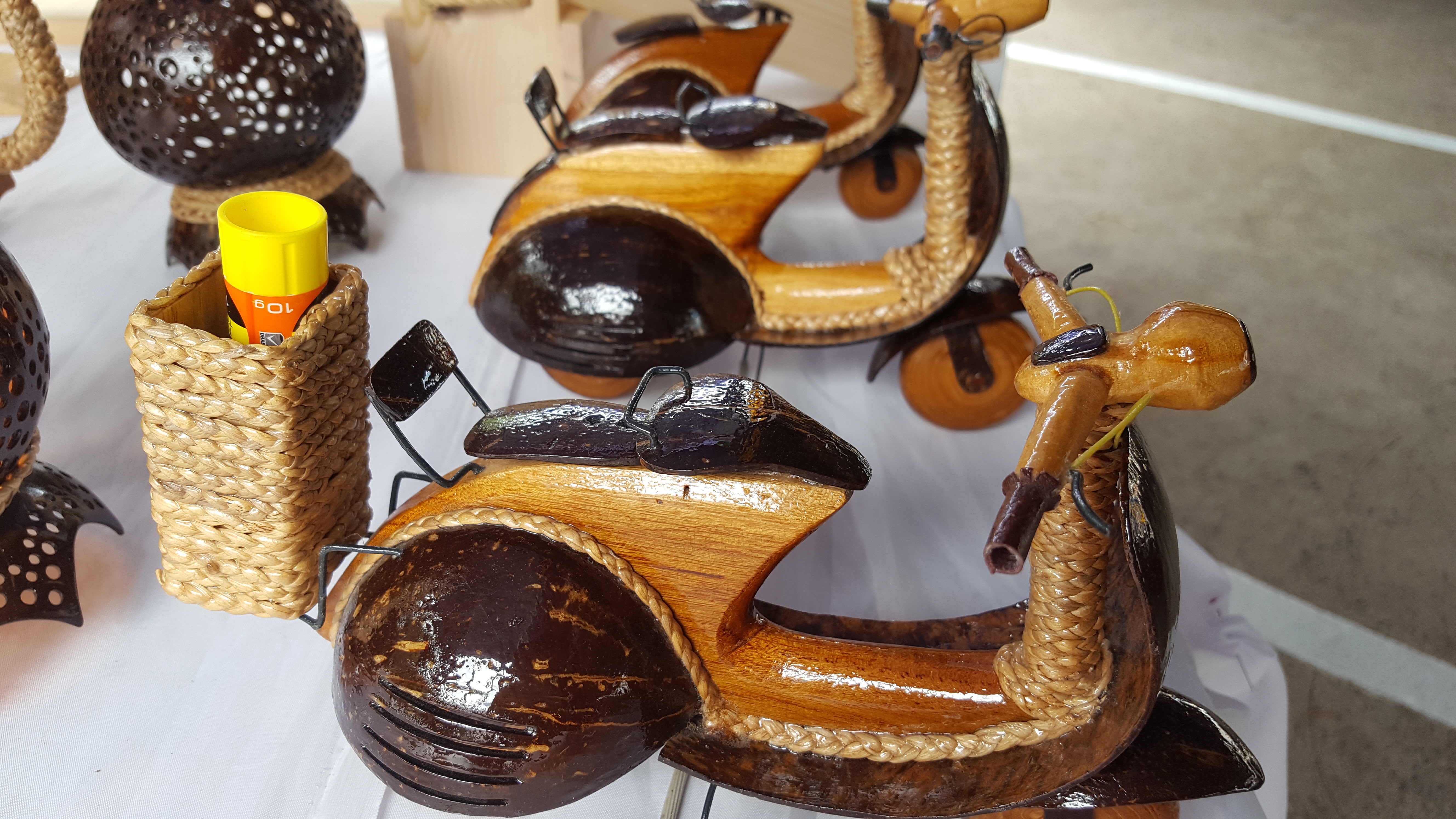 | คำอธิบาย : ผลิตภัณฑ์จากกะลามะพร้าว เป็นภูมิปัญญาของชาวบ้านในการนำกะลามะพร้าวมาประดิษฐ์เป็นเครื่องประดับและของใช้ภายในครัวเรือน |
