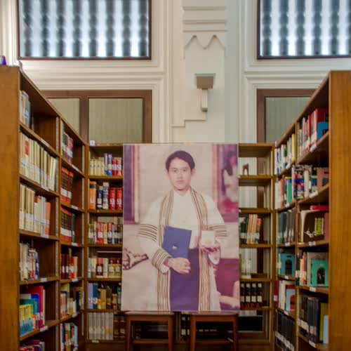 ตู้หนังสืออ้างอิง และ พระฉายาลักษณ์สมเด็จพระเทพรัตนราชสุดา ฯ สยามบรมราชกุมารี ในวันรับพระราชทานปริญญาบัตร ได้รับใบอนุญาตภายใต้ ให้เผยแพร่-ดัดแปลง-โดยต้องระบุที่มาแต่ห้ามใช้เพื่อการค้า 3.0 Thailand.