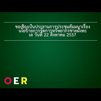 ขอเชิญเป็นประธานการประชุมสัมมนาเรื่องนโยบายการจัดการทรัพยากรชายฝั่งทะเล วันที่ 22 สิงหาคม 2537 ได้รับใบอนุญาตภายใต้ ให้เผยแพร่-โดยต้องระบุที่มาแต่ห้ามดัดแปลงและห้ามใช้เพื่อการค้า 3.0 Thailand.