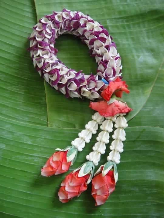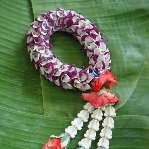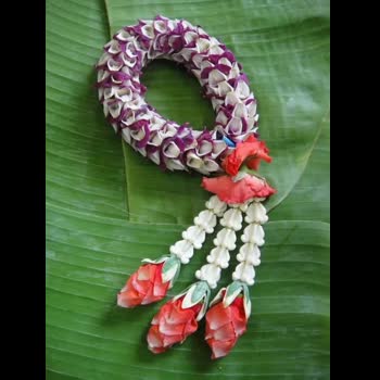 | คำอธิบาย : พวงมาลัย คือพวงดอกไม้ประดิษฐ์ ที่นำดอกไม้ ใบไม้ ต่าง ๆ เช่น กลีบดอกกุหลาบมอญ ดอกพุด ดอกรัก ดอกผกากรอง ใบแก้ว ดอกข่า ดอกมะลิ ดอกมะลุลี ดอกบานไม่รู้โรย ดอกเล็บมือนาง บานบุรี หงอนไก่ รักเร่ เฟื่องฟ้า มาร้อยเป็นพวงมาลัย โดยมักจะนำมาใช้กราบไหว้พระและสิ่งศักดิ์สิทธิ์ รวมถึงนำไปไหว้ บิดามารดา ญาติผู้ใหญ่ ตามเทศกาลต่าง ๆ |