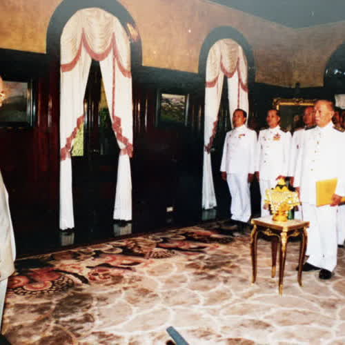 | คำอธิบาย : พระบาทสมเด็จพระเจ้าอยู่หัว พระราชทานพระราชวโรกาสให้ ตุลาการศาลปกครองสูงสุดเข้าเฝ้าฯ ถวายสัตย์ปฏิญาณ \วันที่ 19 มิถุนายน 2543 |