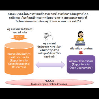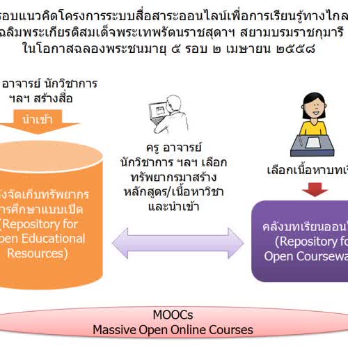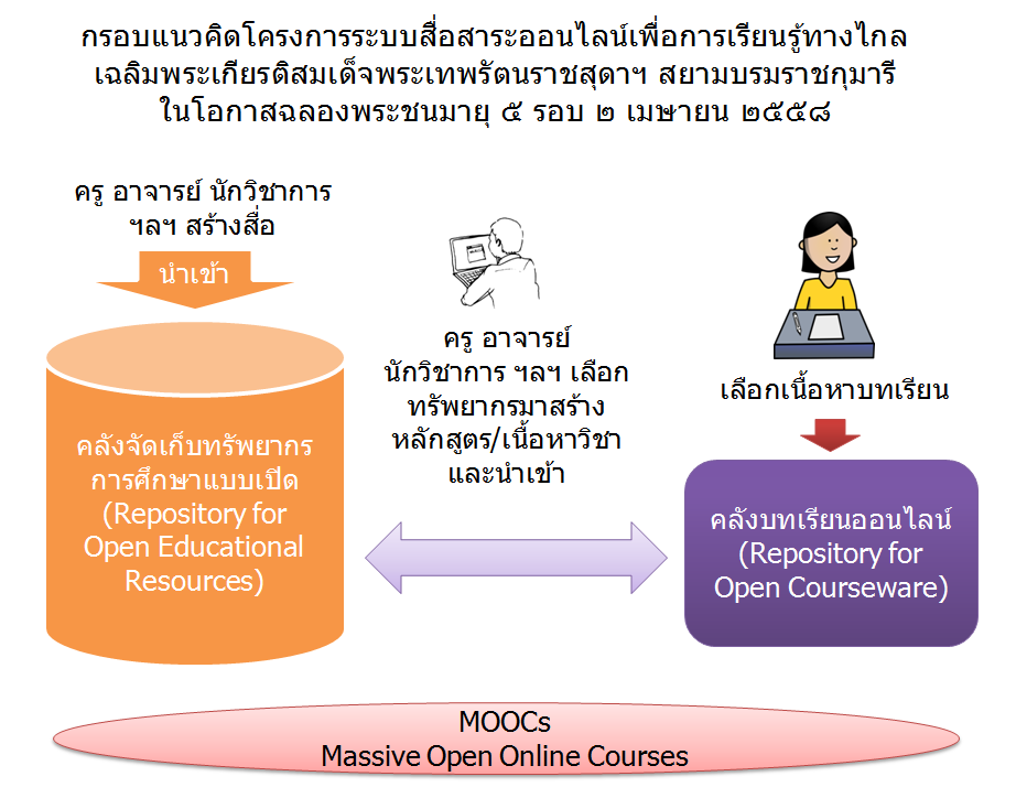 | คำอธิบาย : กรอบแนวคิดโครงการระบบสื่อสาระออนไลน์เพื่อการเรียนรู้ทางไกลเฉลิมพระเกียรติสมเด็จพระเทพรัตนราชสุดาฯ สยามบรมราชกุมารี ในโอกาสฉลองพระชนมายุ ๕ รอบ ๒ เมษายน ๒๕๕๘ |