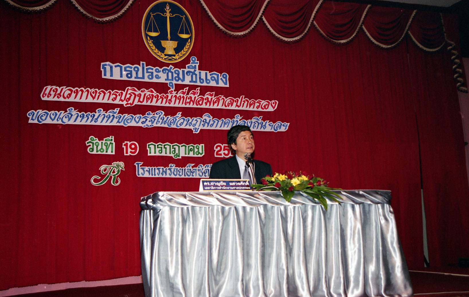 | คำอธิบาย : การประชุมชี้แจงแนวทางการปฏิบัติหน้าที่เมื่อมีศาลปกครอง ของเจ้าหน้าที่ของรัฐในส่วนภูมิภาค ท้องถิ่น ฯลฯ จังหวัดร้อยเอ็ด วันที่ 19 กรกฎาคม 2545 |