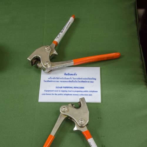 | คำอธิบาย : เครื่องมือใช้สำหรับบีบตัวตะกั่ว ในการจัดทำกล่องใส่เหรียญโทรศัพท์สาธารณะ ของแผนกจัดเก็บเงินโทรศัพท์สาธารณะ |