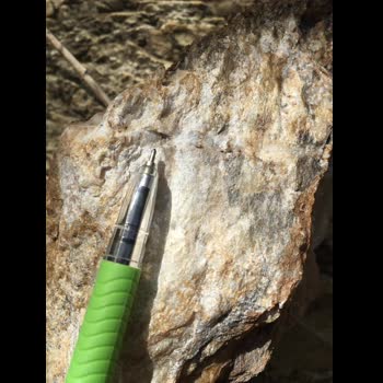 | คำอธิบาย : หินไรโอไลต์ (Rhyolite) ดังกล่าวพบบริเวณอำเภอเถิน จังหวัดลำปาง จัดเป็นหินอัคนีพุ หรือหินภูเขาไฟ เกิดจากการเย็นตัวและตกผลึกของลาวา จึงทำให้เนื้อหินมีลักษณะละเอียด เพราะอัตราการเย็นตัวและตกผลึกเป็นไปอย่างรวดเร็ว มีสีเทา แร่ประกอบส่วนใหญ่เหมือนหินแกรนิตแต่มีขนาดของผลึกละเอียดว่า ส่วนใหญ่ประกอบด้วยแร่ควอร์ต และเฟล์ดสปาร์ |