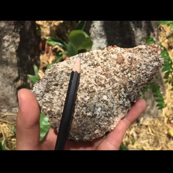| คำอธิบาย : หินแกรนิต (Granite) ดังกล่าวพบบริเวณอำเภอดอยเต่า จังหวัดเชียงใหม่ จัดเป็นหินอัคนีแทรกซอน เกิดจากการที่หินหนืดหรือแมกมาเย็นตัวลงภายในเปลือกโลกอย่างช้าๆ ทำให้ผลึกแร่มีขนาดใหญ่ หินแกรนิตที่พบมีเนื้อหยาบ ส่วนใหญ่ประกอบด้วยแร่เฟล์ดสปาร์ ไบโอไทต์ และมัสโคไวท์ |