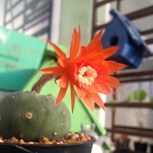 | คำอธิบาย : เป็นกระบองเพชรที่มีดอกสีส้มสด ต้นกลมผิวเรียบมีบั้ง ดูคล้ายๆ แอสโตโฟตั้มแอสมีเรียส |