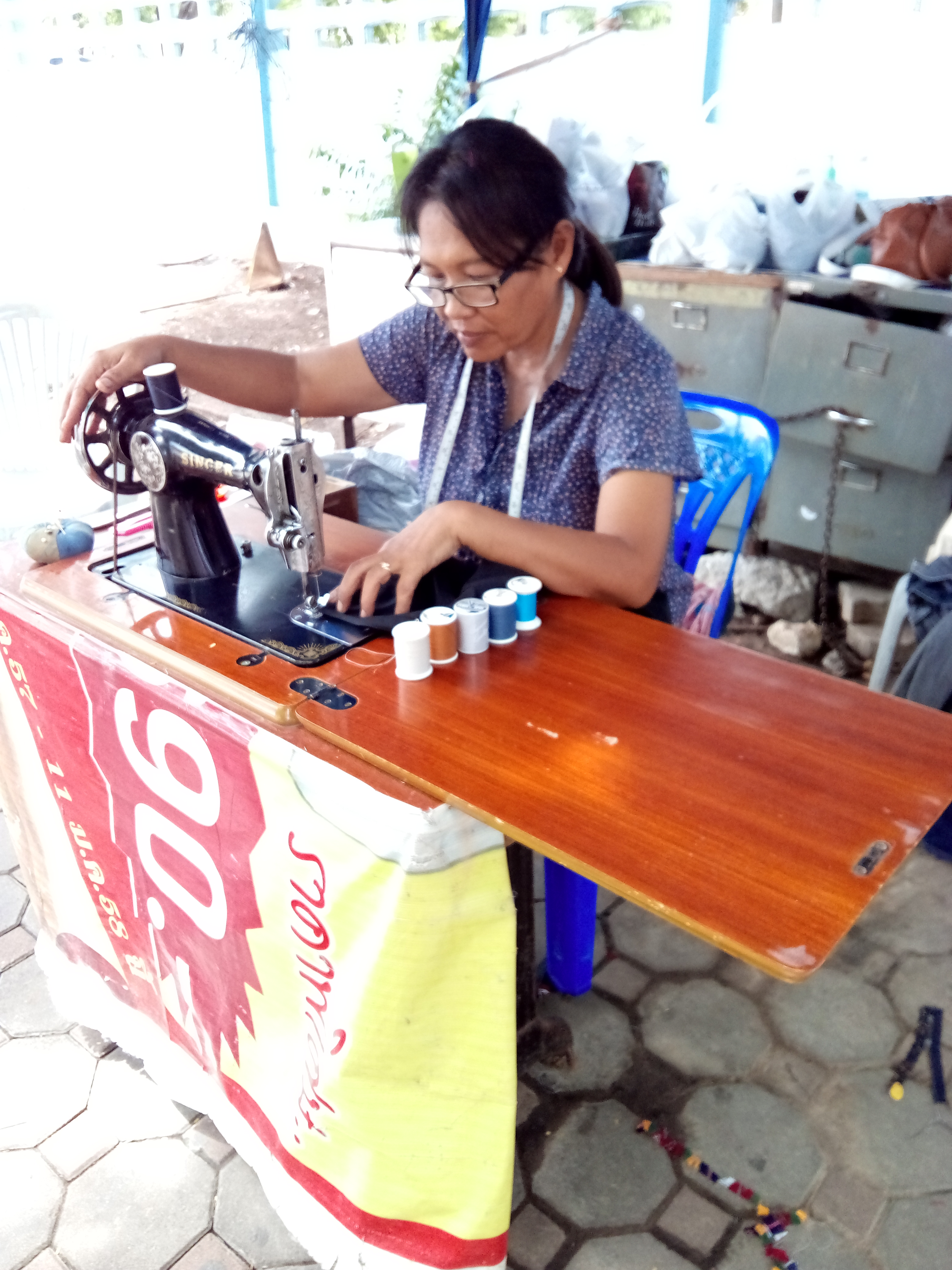 | คำอธิบาย : ภาพนี้ได้รับอนุญาตจากพี่สา จ.ขอนแก่น ไม่ประสงค์แจ้งชื่อจริง สามารถนำภาพไปประกอบการเรียนการสอนได้ พี่สาประกอบอาชีพเย็บและซ่อมแซมเสื้อผ้า เป็นอาชีพที่สุจริตสร้างรายได้แก่ครอบครัว \มีการลงทุนดังนี้\จักรเย็บผ้า 10000\ด้าย เข็ม ตู้เก็บของ 3000\รวม 13000 บาท\สามารถประกอบอาชีพได้ โดยหาทำเลที่เหมาะสม มีผู้คนอาศัยหรือเป็นทางผ่าน. \ราคาในปี 2559. เปลี่ยนซิบ 30-50 บาท. ใส่ยางยืด 20-30 บาท. ตัดขากางเกง 2 ข้าง 60 บาท. รายได้เฉลี่ย 8 พันบาทต่อเดือน\ใช้เวลาคืนทุนประมาณ 1เดือน ครึ่ง |