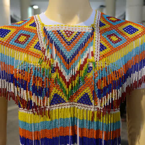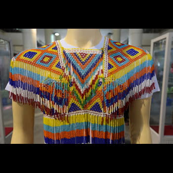 | คำอธิบาย : เครื่องรูปปัด เครื่องรูปปัดจะร้อยด้วยลูกปัดสีเป็นลายมีดอกดวง ใช้สำหรับสวมลำตัวท่อนบนแทนเสื้อ ประกอบด้วยชิ้นสำคัญ 5 ชิ้น คือ บ่า สำหรับสวมทับบนบ่าซ้าย-ขวา รวม 2 ชิ้น ปิ้งคอ สำหรับสวมห้อยคอหน้า-หลังคล้ายกรองคอหน้า-หลัง รวม 2 ชิ้น พานอก ร้อยลูกปัดเป็นรูปสี่เหลี่ยมผืนผ้า ใช้พันรอบตัวตรงระดับอก บางถิ่นเรียกว่า"พานโครง"บางถิ่นเรียกว่า"รอบอก" เครื่องลูกปัดดังกล่าวนี้ใช้เหมือนกันทั้งตัวยืนเครื่องและตัวนาง (รำ) แต่มีช่วงหนึ่งที่คณะชาตรีในมณฑลนครศรีธรรมราชใช้อินทรธนู ซับทรวง (ทับทรวง) ปีกเหน่ง แทนเครื่องลูกปัดสำหรับตัวยืนเครื่อง |