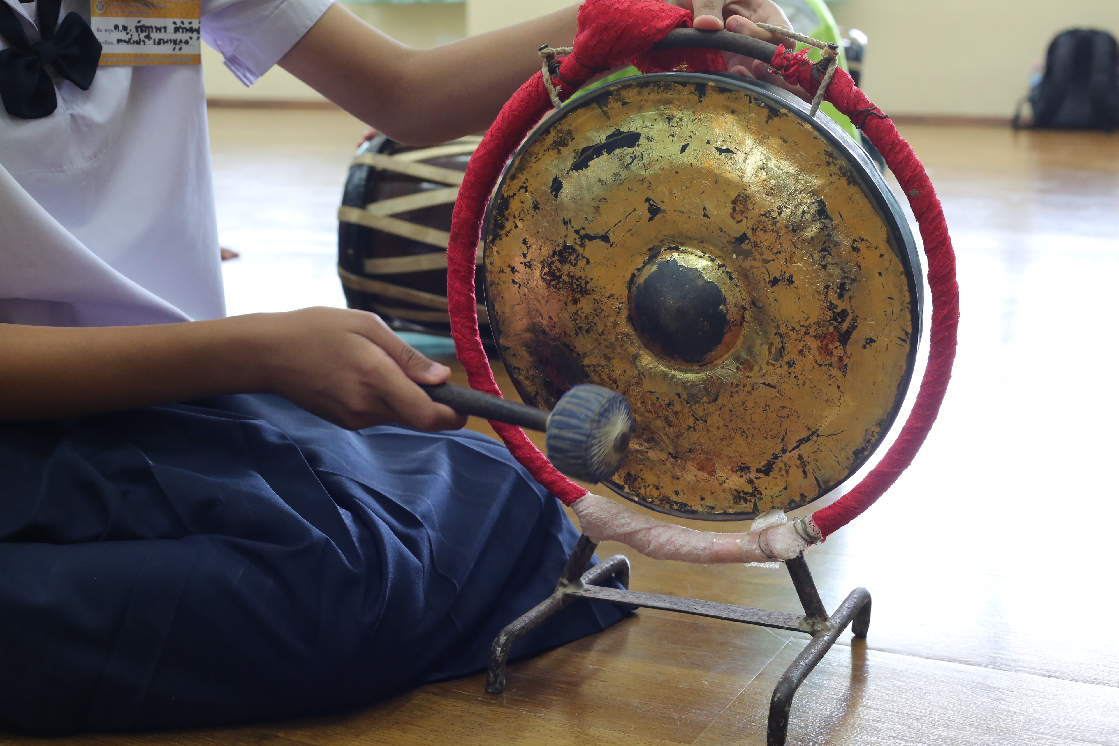 | คำอธิบาย : ฆ้อง ถือเป็นเครื่องดนตรีที่มีมีแต่ครั้งโบราณ จัดอยู่ในประเภทเครื่องตี มีความเชื่อกันว่า ฆ้องมีถิ่นกำเนิดในแถบชวา (ประเทศอินโดนีเซีย) และแพร่หลายไปทั่วภูมิภาคเอเชียตะวันออกเฉียงใต้ ตัวฆ้องมักจะทำจากแผ่นโลหะตรงกลางเป็นปุ่มนูน ใช้ประกอบกับไม้ตีที่ทำจากไม้ ตรงปลายเป็นกระเปาะผ้าหนา เสียงของฆ้องจะดังกังวาน ฆ้องจึงมักถูกใช้ในพิธีกรรมต่างๆ เช่น การใช้เป็นสัญญาณทำสงครามสมัยก่อน พิธีกรรมทางศาสนา เป็นต้น |